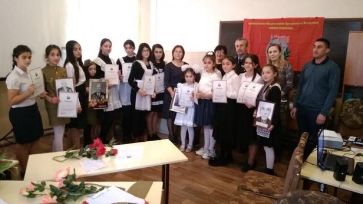 Также грамотами от КБРО ВООВ «Боевое братство» за проведение патриотической работы среди молодёжи и плодотворное сотрудничество с организацией была награждена учитель французского языка Фатима Лигидова – инициатор конкурсов. Она сказала, что перед участием в конкурсе с каждым учеником была проведена разъяснительная беседа для определения темы работы. В итоге оказалось, что все ученики рисовали и писали сочинения о своих близких родственниках (прадедах), участвовавших в Великой Отечественной войне, они принесли в школу их портреты. Также немаловажно, что в этой работе принимали активное участие родители учеников, которые с охотой рассказывали детям о родных – героях.