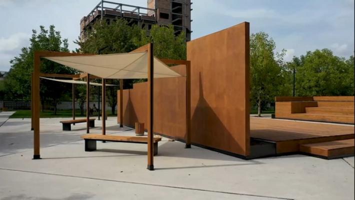 Пространство разделено на несколько ярких зон. В центре сквера расположен амфитеатр со сценой, где горожане и гости столицы Кабардино-Балкарии могут проводить различные мероприятия. Благоустроены протяжённые прогулочные дорожки с гладким покрытием из бетонных блоков, вдоль которых установлены параболические и двусторонние скамьи, перголы с качелями, а также уютные беседки. Все объекты выполнены в едином стиле, преобладающий материал – дерево. На фоне насыщенного древесного оттенка выделяется зона, выполненная в красном цвете, она предназначена для более уединённого и спокойного отдыха.