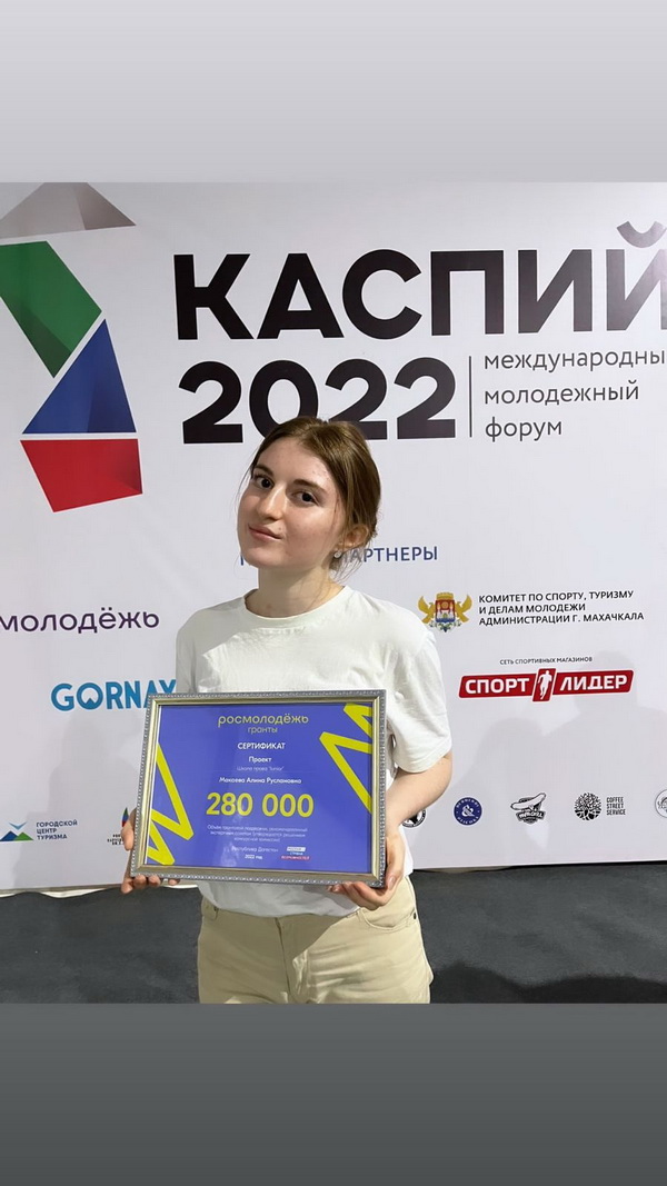 Проект «Школа права» успешно существует с 2021 года. Тогда Алина Макаева победила в грантовом конкурсе Росмолодёжи на форуме «Каспий-2021». Позже, в 2022 году организаторы сосредоточились на творческой молодёжи, общий охват участников проекта «Школа права: культурное просвещение» достиг 500 человек.