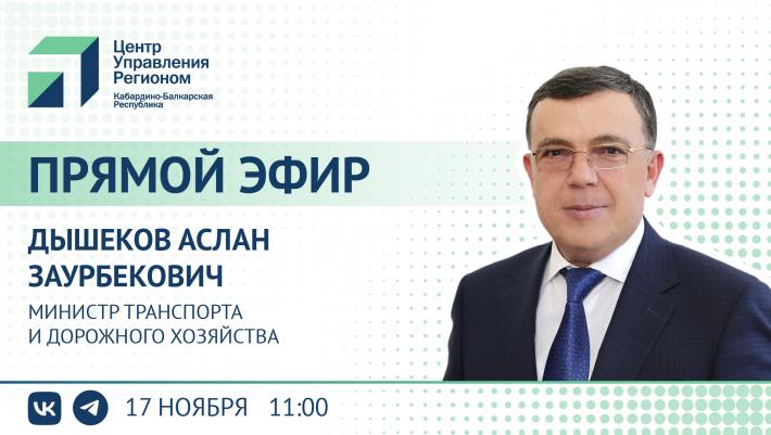 На этой неделе гостем рубрики станет министр транспорта и дорожного хозяйства КБР Аслан Дышеков. Трансляция прямого эфира состоится 17 ноября в 11:00 на площадке официального сообщества Правительства КБР во «ВКонтакте» и «Telegram».