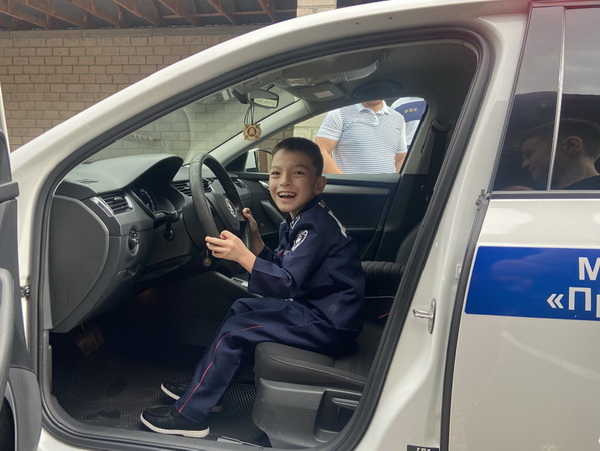 Особые эмоции у ребёнка вызвала возможность посидеть в настоящем патрульном автомобиле, узнать об оснащённости служебного транспорта, звуковой и громкоговорящей установке.