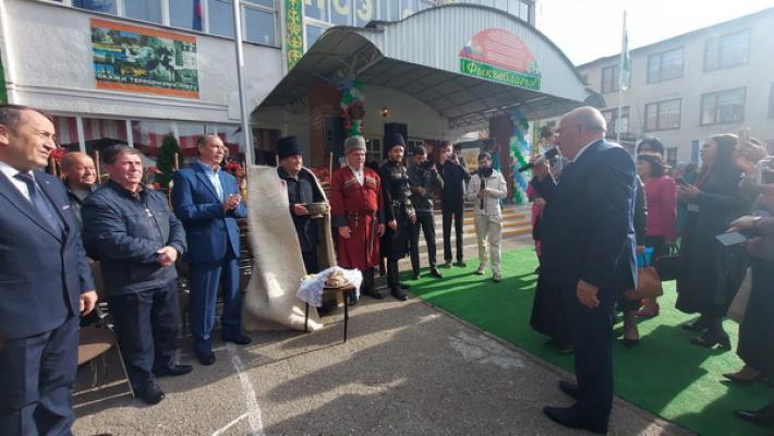 Руководство школы и учащиеся во дворе продемонстрировали щедрое гостеприимство адыгов - обычаи и традиции, связанные со знакомством невесты с семьёй, рождением малыша и первыми шагами ребёнка. Конкурсную делегацию встречали конным шествием, зажигательными национальными танцами. Во дворе показывали старинные игры, мастер-классы по приготовлению национальных блюд, предметы быта адыгов.