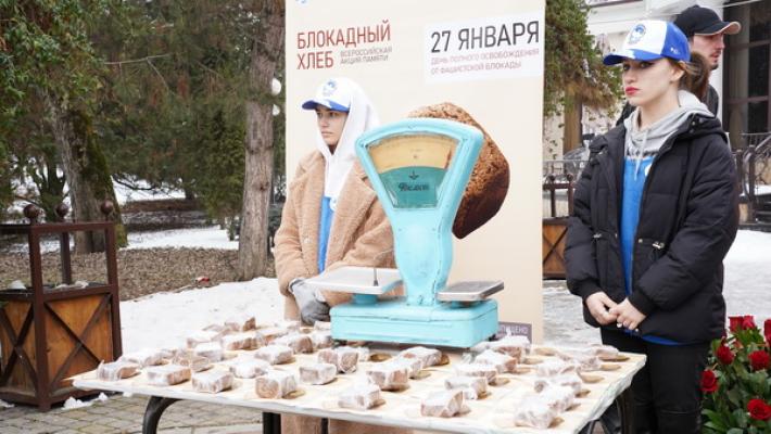 – 8 сентября 1941 года город был заблокирован. В окольцованном вражеской армией Ленинграде оказалось более 2,5 миллиона жителей, в том числе 400 тысяч детей. Ленинградское сражение охватило почти всю северо-западную часть страны и длилось более трёх лет. На защиту города поднялись все его жители: 500 тысяч ленинградцев строили оборонительные сооружения, 300 тысяч ушли добровольцами в народное ополчение, на фронт и в партизанские отряды. Блокада города, вражеские обстрелы продолжались 872 дня. Блокада Ленинграда унесла жизни около полутора миллиона жителей города. От фашистских бомбёжек погибли лишь 3 % людей, остальные 97 % – от голода: ежедневно от истощения умирали около 4 тысяч человек. Ключевым символом акции «Блокадный хлеб» является кусочек хлеба весом в 125 граммов – именно такая минимальная норма выдачи хлеба на человека в день была установлена во время блокады Ленинграда. Вы можете попробовать те 125 граммов, которые спасли сотни тысяч человеческих жизней, 125 граммов, которые были дороже всех денег мира, – предложили артисты собравшимся.