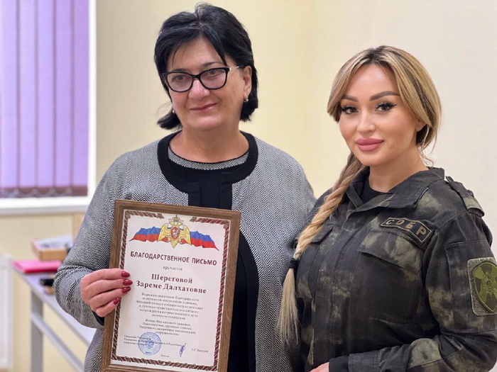 Вручили благодарственные письма педагогам Офицер Управления Росгвардии по КБР Марина Лукожева от имени начальника тероргана Сергея Васильева вручила благодарственные письма директору нальчикской школы № 8 Зареме Шереговой и завучу по учебно-воспитательной работе Джамиле Джаппуевой. Руководство школы наградили за активное сотрудничество с представителями ведомства в сфере патриотического, духовного воспитания молодёжи и содействие в организации новогоднего концерта для учащихся кадетских классов селения Ново-Ивановское, городов Нарткалы и Баксана, представителей региональных общественных организаций и молодёжного правительства республики.