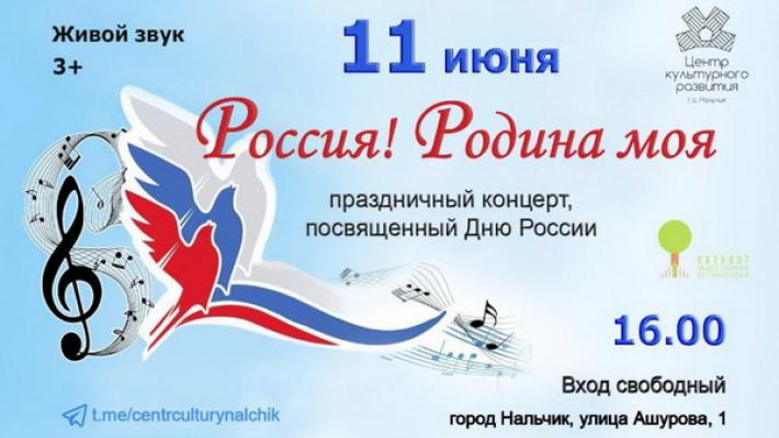 В честь Всероссийского праздникаВ преддверии Дня России 11 июня в 16.00 в Центре культурного развития (Нальчик, ул. Ашурова, д. 1) состоится праздничный концерт, посвящённый этому празднику.