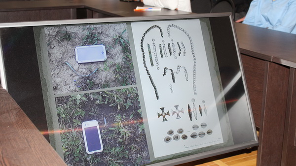 В соседней яме, где захоронена женщина, найдены предметы, которые могли бы быть пуговицами, но однозначно утверждать, что это именно они, пока нельзя. Поэтому учёные пока остановились на осторожной формулировке «бронзовые бляшки», тем более что подобные «пуговицы» попадаются в ожерельях, а также в украшениях головных уборов. Нашли здесь и подвеску, изображающую голову животного. Такие часто находили в прошлом году. В этом году их нашли больше, причём количество видов изображаемых зверей также увеличилось.