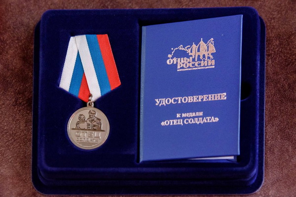 Награда «Отец солдата» учреждена по инициативе Всероссийского движения «Отцы России», которая по праву получила всенародное признание. На её лицевой стороне отчеканены силуэты отца и сына – как символ преемственности поколений и верности своему долгу. Медаль вручают отцам, достойно воспитавшим сыновей-героев, чьи имена навсегда будут вписаны в историю нашей страны.