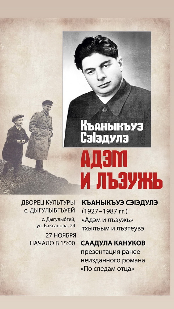 Кабардинский писатель Саадула Кануков (1927 – 1987) известен читателям по книге «Девушка из Ленинграда», которая выходила на кабардинском языке в издательстве «Эльбрус», а на русском – в издательстве «Детская литература». Это издание очень понравилось читателям, особенно детям. В 2022 году «Девушка из Ленинграда» была переиздана на двух языках – адыгском и русском. До «Девушки из Ленинграда» была опубликована автобиографическая повесть Канукова «Неудержимое стремление», а в начале семидесятых годов писатель завершил работу над романом «Адэм и лъэужь», который теперь, спустя полвека, пришёл к читателю. Несмотря на неизлечимую болезнь, Саадула Кануков работал до последних своих дней. После него остался недописанным роман «Аушигер»Герои произведения С. Канукова – обычные люди, жизнь которых пришлась на эпоху перемен. Бурные события начала прошлого века, революция 1917 года, становление советской власти на Северном Кавказе, классовое противостояние – в романе воссозданы события того непростого времени, ярко выписаны герои, оставившие след в истории Кабардино-Балкарии. Глазами одного из них – Тамыты, сына революционера, читатели видят его товарищей, которым пришлось испытать на себе всю тяжесть наступивших перемен.