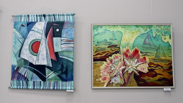 Особое внимание привлекают работы, выполненные в технике горячего батика. Марина Голованова и Вера Шепилова представляют зрителям пейзажи и натюрморты, поражающие декоративным исполнением и тонкой игрой оттенков, передающих богатство окружающего мира.