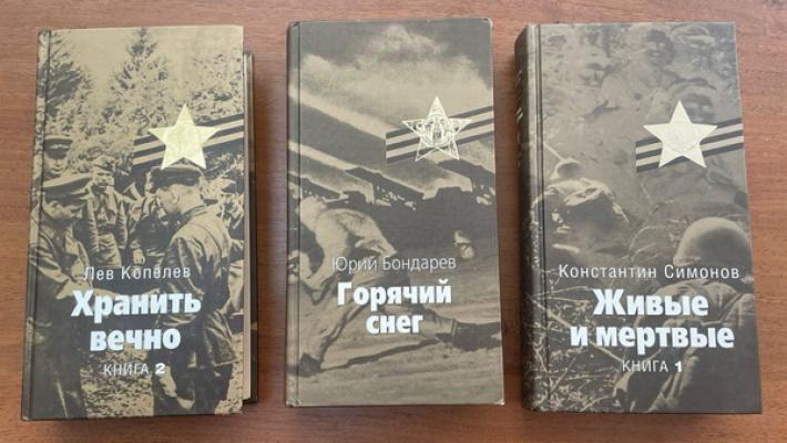 На выставке представлены книги, наиболее ярко рассказывающие о тяжелейшем для нашей страны периоде. Среди них – одно из самых проникновенных и трагических произведений о Великой Отечественной войне - повесть Б. Васильева «А зори здесь тихие», роман-трилогия советского писателя Константина Симонова о Великой Отечественной войне, роман советского писателя‑фронтовика Ю. Бондарева «Горячий снег», автобиографическое произведение писателя, офицера, участника Великой Отечественной войны Л. Копелева «Хранить вечно». А также рассказы о войне Л. Пантелеева, сборники стихов о войне и Победе для самых юных читателей.