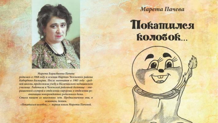 – Марета Пачева родилась в 1968 году в селении Нартан Чегемского района. После окончания нальчикского медицинского училища работала в Чегемской районной больнице: операционной сестрой в отделении хирургии, в отделении реанимации новорождённых родильного дома, – рассказывает Виктор Котляров – И все эти годы, начиная со школьных лет, писала стихи, обращённые к детям. Лучшие из них (на русском и кабардинском языках) составили книжку «Покатился колобок…», которую сама автор и проиллюстрировала. Один из этих рисунков воспроизведён на обложке издания. Тираж книги – 300 экземпляров.