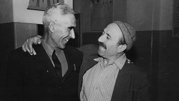 ![]() Кайсын Шуваевич Кулиев и Герой Социалистического Труда, председатель колхоза имени Чапаева (Карагач) Нажмудин Билялович Абубекиров в школе селения Карагач.