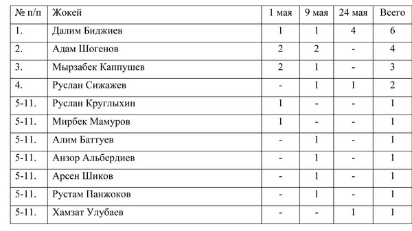 После двух стартовых дней лидерство захватили Адам Шогенов, выигравший 4 скачки, и Мырзабек Каппушев, имевший в своём активе три трофея. Но 24 мая, когда разыгрывали не традиционные, а именные призы, оба лидера на дорожке не появились. Этим воспользовался Далим Биджиев, выигравший четыре скачки из шести проведённых.