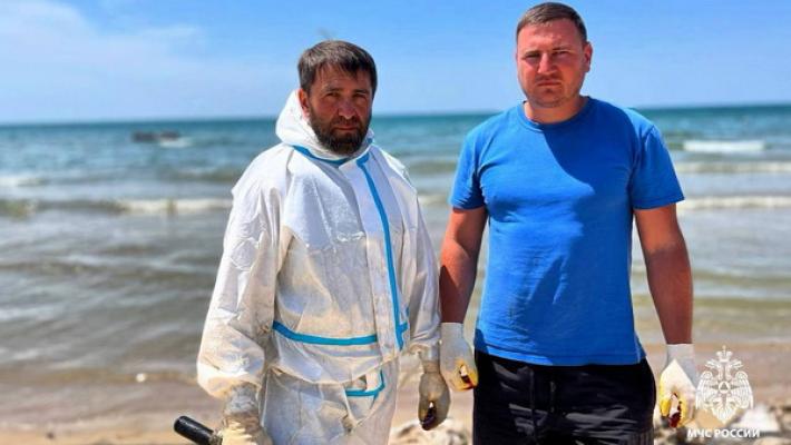 Спасатель-водолаз Эльбрусского высокогорного ПСО Тагир Мехдиев в составе сводного отряда МЧС России задействован в работе по очистке загрязнённых участков Черноморского побережья.