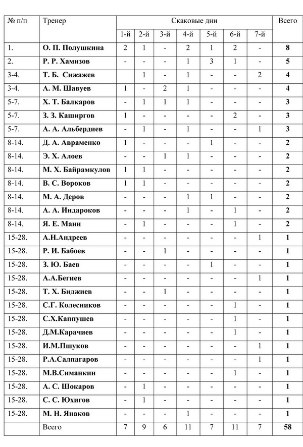 Удивительные вещи происходят в рейтинге тренеров, побеждавших на нальчикском ипподроме в 2025 году. Всего в этом сезоне разыграно 58 призов, а в числе триумфаторов уже 28 специалистов. Чуть больше двух скачек в среднем на успешного тренера. Ровно у половины наставников, попавших в почётный список всего по одной победе.
