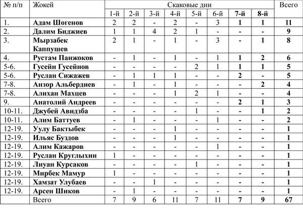 Скаковые дни: Примечание: при равенстве очков, спортсмены расположены в таблице по алфавиту.