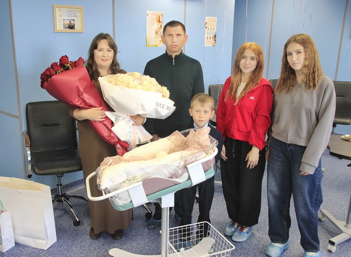 Алий Мусуков поздравил с рождением десятого ребёнка и вручил семье Алешко из станицы Екатериноградской комплект документов, подготовленный в офисе МФЦ при центре для новорождённой Екатерины. Для счастливых многодетных родителей также подготовили памятные подарки.