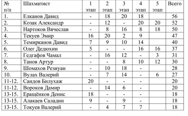 Зачётные очки Кубка КБР по рапиду (после 5-х этапов)
