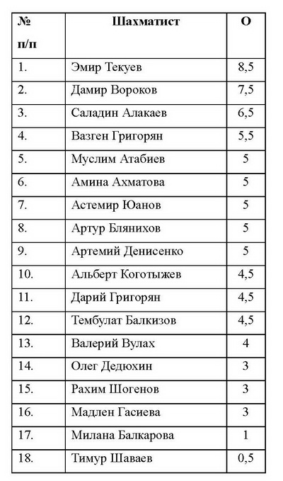 Прогнозы оказались точными на все сто процентов. Чемпионом Нальчика стал Эмир Текуев, набравший 8,5 очка из 9 возможных. На одно очко отстал Вороков. Третий результат - 6,5 очка – у Алакаева.