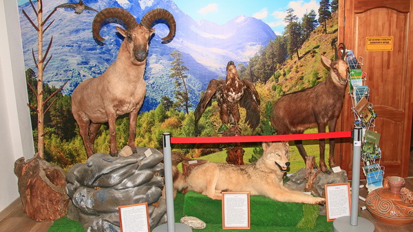 В первом зале гостей музея встречают виды гор и представители фауны. Экспонаты помог собрать национальный парк Приэльбрусье, с которым музей активно сотрудничает.