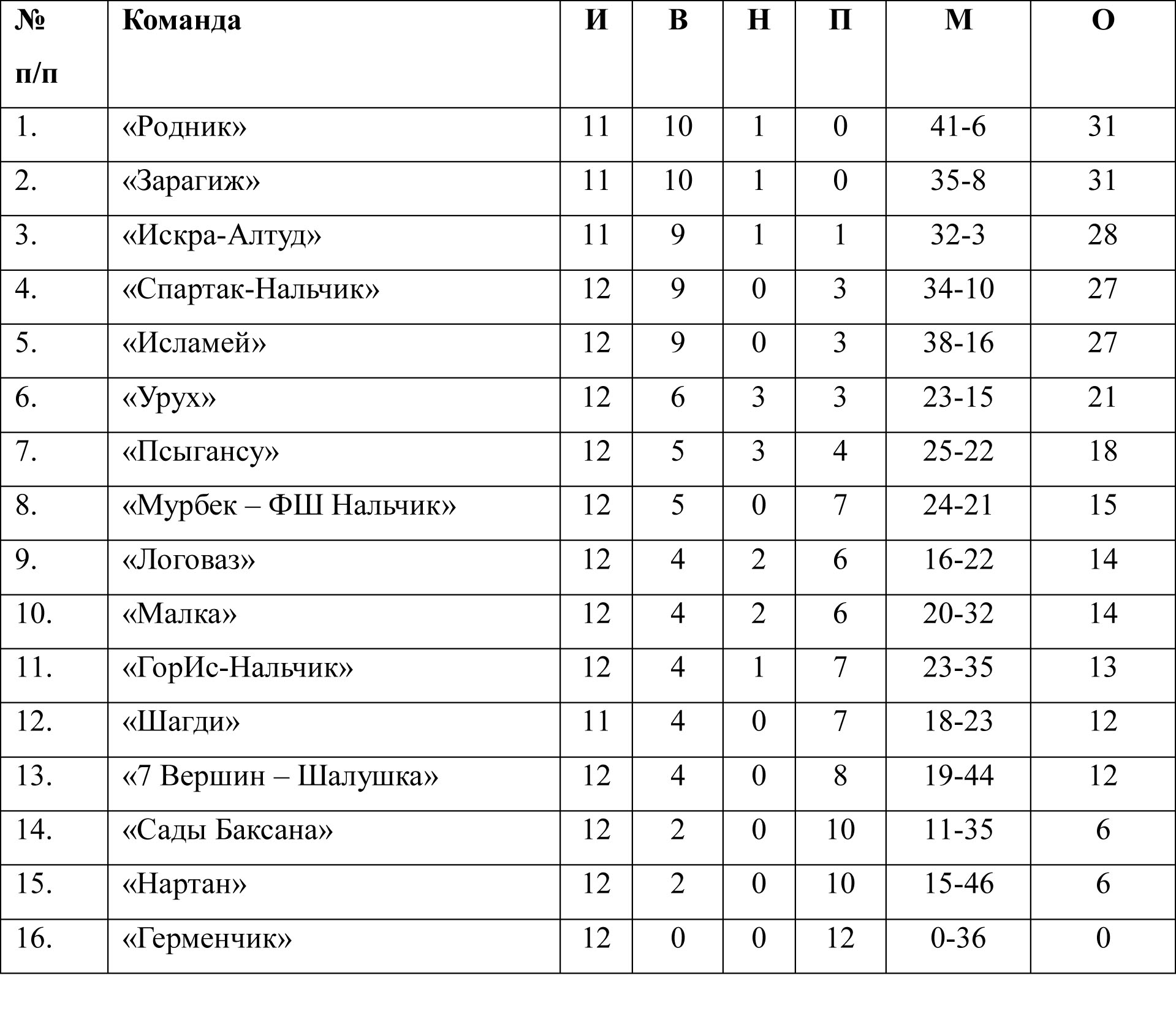 Таблица зимнего чемпионата КБРсреди команд высшего дивизиона.