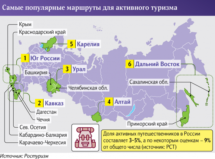 Кабардино-Балкария – одно из самых популярных направлений для активного отдыха![]() Ростуризм назвал «Известиям» пять самых популярных направлений для активного отдыха на природе в России. В топ-5 вошли Юг России (Крым и Краснодарский край), Кавказ (Дагестан, Кабардино-Балкария, Карачаево-Черкесия), Урал (Башкортостан и Челябинская область), Алтай и Карелия. В последние годы наблюдается повышение интереса к активному отдыху на природе. Все более популярными становятся альпинизм, треккинг – пешие прогулки различного уровня сложности, конные маршруты, экстремальные виды спорта: сплав по горным рекам, парапланеризм и т.д. Раньше значительная часть этого направления туризма приходилась на другие государства. Сейчас, в том числе из-за пандемийных ограничений, поток переориентировался на внутрироссийский рынок, и доля туристов, выбирающих туры с активным отдыхом, по оценкам Российского союза туриндустрии, достигает 9%. У каждого из таких мест есть свои точки притяжения. На Кавказе это экотропы по живописным ущельям, вдоль горных рек, водопадов и озер, в Челябинской области — заповедник «Таганай», на Алтае —Телецкое озеро. А в Камчатском крае — озера, фумаролы (отверстия, откуда выходят пар и вулканические газы), водопады, а также вулканы, на которые можно подниматься. Но, помимо набирающего популярность общего тренда на экопутешествия, повышенный интерес к Северному Кавказу вызван в том числе и относительно невысокой стоимостью авиабилетов: по информации сервиса по продаже билетов Aviasales осенью можно слетать туда и обратно даже за 5 тыс. рублей.