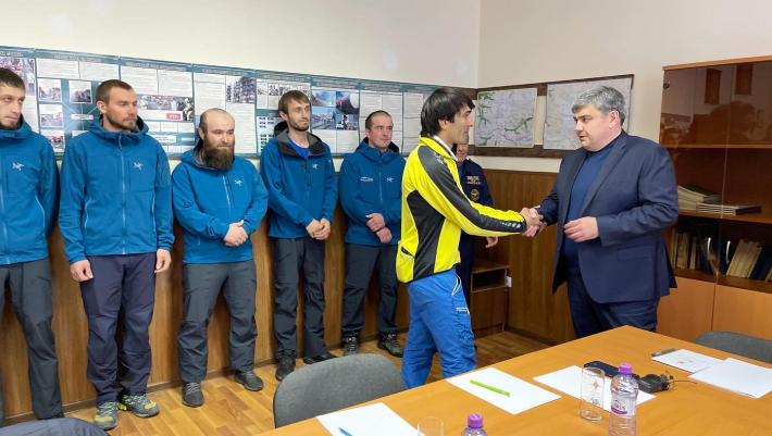 Сегодня Казбек Коков встретился с личным составом высокогорного поисково-спасательного отряда и выразил благодарность спасателям, которые в сложнейших погодных условиях на высоте более пяти тысяч метров смогли отыскать и спустить с горы туристов, терпящих бедствие. Во встрече с Главой республики участвовали сотрудники Эльбрусского высокогорного поисково-спасательного отряда МЧС России: спасатели третьего класса Рамазан Азаматов и Михаил Стороженко, спасатель 2 класса Бека Цинделиани, спасатель 1 класса Анзор Хаджиев, спасатели Ислам Аттаев и Куанч Байдаев, сотрудники Всесезонного туристско-рекреационного комплекса «Эльбрус»: руководитель службы эксплуатации Арсен Апсуваев, заместитель начальника профессионального аварийно-спасательного формирования Азамат Акбулатов, спасатель Алексей Водолазкин.