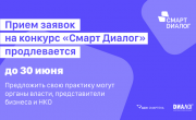 Приём заявок на конкурс «Смарт Диалог» продлен до 30 июняАгентство стратегических инициатив и АНО «Диалог Регионы», головная организация Центров управления регионами, приняли решение продлить прием заявок на конкурс лучших управленческих практик «Смарт Д |